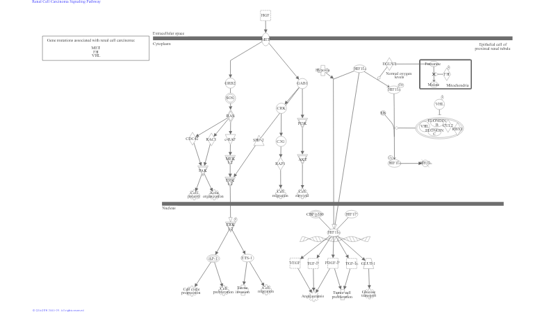Renal cell carcinoma (RCC) refers to various neoplasms of renal origin. The four major histological subtypes are conventional (clear cell RCC), papillary, chromophobic, and collecting duct. Four genes have been well studied in the hereditary form of renal carcinoma. These are von Hippel-Lindau(VHL), MET, fumarate hydratase (FH) and Birt Hogg Dube (BHD).VHL associated tumors are clear cell carcinomas. Mutations in the VHL gene prevent the ubiquitination of HIF-1α leading to its accumulation. This results in the production of growth factors that enhance angiogenesis and cell growth. Mutations in the FH gene cause hereditary leiomyomatosis and renal cancer syndrome papillary renal tumors. Mutations in FH also lead to accumulation of fumarate in the cell eventually preventing VHL-mediated degradation of HIF-alpha.The oncogene MET has also been implicated in hereditary papillary renal cancer. Activating mutations in the tyrosine kinase domain of MET lead to changes in cell motility, cellular transformation, prevention of apoptosis and metastasis. BHD is a novel tumor supressor gene whose function in normal cells and role in RCC is yet to be determined.