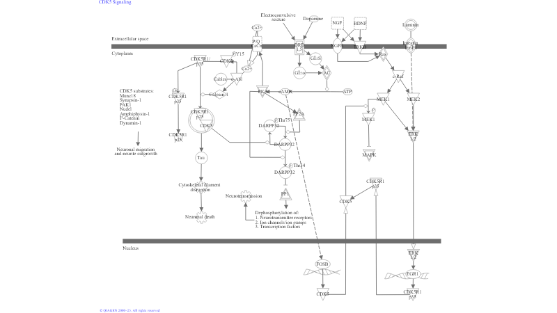 Cyclin-dependent kinases (CDKs) are a group of serine/threonine protein kinases which regulate post-mitotic processes such as neuronal activity, neuronal migration during development, and neurite outgrowth. Activation of CDK5 requires its association with a regulatory subunit p35/CDK5R1. p35 is a short-lived protein, and its phosphorylation by CDK5 targets it for ubiquitin-mediated proteolysis. Calpain1 also directly cleaves p35 to release a 25 kD protein product, which causes prolonged activation and mislocalization of CDK5 and hyperphosphorylation of Tau (a neuron-specific MAP), leading to the formation of paired helical filaments and apoptosis. Post-translational modifications, such as phosphorylation by c-Abl (through an Abl-binding adaptor protein called Cables), regulate CDK5 kinase activity. Engagement of the integrin receptors by laminin stimulates transcription of p35. NGF and BDNF bind to receptors induce the ERK-mediated expression of p35, which requires the transcription factor EGR1. Phosphorylation of Tau by CDK5 reduces the binding of Tau to microtubules, inhibits the ability of Tau to promote microtubule assembly, and decreases microtubule nucleation activity. One target of CDK5 is MEK1. Phosphorylation of MEK1 by CDK5 represses MEK1 activity and blocks downstream cellular responses. The activation of p35 by MAPK pathways followed by deactivation of MAPK signaling by the CDK5/p35 complex completes the loop of a feedback circuit to terminate MAPK signaling. CDK5 induces PAK1 hyperphosphorylation in a Rac-dependent manner, which results in downregulation of PAK1 kinase activity.The p35-CDK5 complex associates with β-catenin and N-Cadherin, and inhibition of CDK5 activity causes an increase in N-Cadherin-mediated aggregation of neurons. Conversely, active CDK5 dissociates β-Ctnn from N-Cadherin, which is accompanied by a loss of adhesion. β-Ctnn is a substrate of CDK5, and phosphorylation by CDK5 regulates its association with the cadherins. CDK5-mediated phosphorylation of Synapsin-1, MUNC18, Amphiphysin-1, and the α-subunit (1A) of P/Q-type -dependent Ca2+ channels plays a role in synaptic vesicle trafficking and neurotransmitter release. CDK5 is also involved in postsynaptic transmission, and modulates dopaminergic signaling through dopamine receptors (DRD) in the neostriatal region of the brain. DRD stimulates adenlyate cyclase (AC) activity and activates cAMP-dependent protein kinases, which regulate neuronal growth and development. The transcription factor δ-FosB promotes CDK5 expression in response to chronic cocaine and electroconvulsive seizure treatments, implicating the dopaminergic signaling pathway. The role of CDK5 in dopamine responses occurs through phosphorylation of DARPP32. Depending on its phosphorylation state, DARPP32 inhibits either the phosphatase PP1 or the kinase PKA. Phosphorylation of DARPP32 by PKA on Thr34 makes it a potent inhibitor of PP1, and potentiates dopamine-induced phosphorylation of PKA substrates. In contrast, phosphorylation of DARPP32 at Thr75 by CDK5 renders it an inhibitor of PKA. PP1 is also phosphorylated by both PKA and CDK5 with antagonistic consequences. CDK5 activity has also been implicated in the mGluR-mediated enhancement of voltage-dependent Ca2+ currents.CDK5 also has been implicated in the pathological degeneration of neurons. Dysregulation of CDK5 causes the hyperphosphorylation of Tau, thereby contributing to neurofibrillary tangle formation, which is the hallmark of Alzheimer's Disease. CDK5 phosphorylates NUDEL, a novel LIS1-interacting protein in the growth cone. The inhibition of CDK5 activity alters NUDEL localization and its association with the dynein complex, resulting in the alteration of neuronal migration.