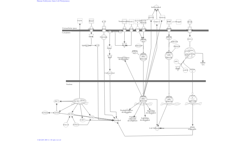 Embryonic stem cells (ESCs) are pluripotent cells capable of differentiating into any cell type of the body. Human ESCs are derived from blastocysts; multicellular structures originating from four cleavages of fertilized oocytes. They are able to spontaneously give rise to different progenies of the three embryonic layers. Human ESC pluripotency is regulated by a combination of extrinsic and intrinsic factors. FGF signaling and a balance between TGF-β/Activin and BMP signaling are central to the self-renewal of human ESCs. Intrinsic factors include a group of transcription factors including Oct4, SOX2 and Nanog.TGF-β superfamily of ligands plays a major role in maintaining the Self-renewing ESCs. They signal through two main branches: the SMAD1/5 branch which transduces on behalf of BMP and GDF ligands via the type I receptors ALK1, ALK2, ALK3 and ALK6 and the TGF-β/Activin/Nodal branch, which involves the activation of SMAD2/3 via ALK4, ALK5 and ALK7. There are also two inhibitory SMADs - SMAD6, which selectively inhibits SMAD1/5; and SMAD7, which inhibits TGF-β signaling. Upon activation by phosphorylation and association with a common SMAD4, receptor activated SMADs translocate to the nucleus and in concert with other transcription factors, regulate gene expression. SMAD2/3 pathway is also required for positive regulation of several factors of TGF-β signaling. These factors include Nodal, Cripto, LEFTY1 and LEFTY2.In contrast to TGF-β/Activin/Nodal signaling which promotes the maintenance of pluripotent human ESCs, BMP signaling is unable to support self-renewal and is associated with differentiation to trophoblast or extraembryonic endoderm cells. In human ESCs, BMP4 induces differentiation into mesoderm and ectoderm, whereas BMP2 promotes extraembryonic endoderm differentiation. Repression of BMP signaling in human ESCs by Noggin and FGF supports long term Self-renewal. Binding of FGF to its receptor and heparin leads to receptor autophosphorylation and activation of intracellular signaling cascades, including the Ras/ERK pathway, the PLC-γ/Ca2+ pathway, and the PI3K pathway. FGF2 promotes self-renewal of human ESCs by activating the PI3K pathway.WNTs play an important role in controlling ESC maintenance. Canonical WNT signaling involves the binding of WNT to the frizzled receptors. This, in turn, activates Dsh, which displaces GSK3β from the APC/AXIN complex, preventing ubiquitin mediated degradation of Ctnn-β. Subsequently, Ctnn-β accumulates and translocates into the nucleus where it associates with TCF/LEF to activate transcription of WNT target genes. WNT signaling is known to be involved in regulating the proliferation of stem cells, including intestinal and hematopoietic cells, and the self-renewal of hematopoietic stem cells.Sphingosine-1-Phosphate (S1P), a bioactive lysophospholipid, also supports human ESC self-renewal. S1P signals both extracellularly through EDG (Endothelial Differentiation Gene) receptors coupled to G-Proteins, and intracellularly by unidentified mechanisms. Because the prevention of apoptosis is a common self-renewal mechanism, S1P potentially aids the self-renewal process in human ESCs cells. PDGF is implicated in the prevention of apoptosis. PDGF promotes intracellular S1P signaling by activating SphK, which in turn converts sphingosine to S1P. The combination of extracellular PDGF and S1P supports human ESC self-renewal.Major transcription factors regulating pluripotency include Oct4, SOX2 and Nanog. Oct3/4 SOX2 partnership is indispensable in the maintenance of pluripotency. Nanog is another member of the group of transcription factors whose functions are deemed essential for the process of self-renewal in Human ESCs. Thus human ESCs exhibit a number of signaling pathways involved in self-renewal and pluripotency.
