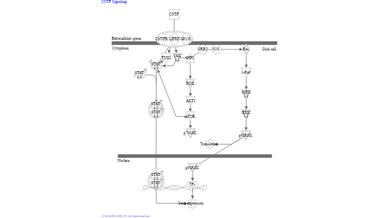 Ciliary Neurotrophic Factor (CNTF) is a protein produced by glial cells that stimulates gene expression, cell survival, and differentiation in a variety of neuronal cell populations. CNTF also acts as a lesion factor involved in the prevention of nerve degeneration after injury. It is a member of the GP130 cytokine family along with structurally related hemato- and neuropoietic cytokines such as IL-6, IL-11, LIF, Oncostatin M, Cardiotrophin-1, Leptin and Cardiotrophin-Like Cytokine. The actions of CNTF are mediated in part by CNTFR-α. Upon translation, the C-terminus of CNTFR-α is cleaved.CNTF signaling is initiated when CNTF binds CNTFR-α, either in its soluble (s) or membrane-bound (mb) form. The soluble form of CNTFR (s-CNTFR), which is produced by Phospholipase-C (PLC)-mediated cleavage of mb-CNTFR, serves as a cofactor in potentiating CNTF actions on cells that express GP130 and LIFR-β. Soluble CNTFR is found in cerebrospinal fluid and serum and is involved in mediating some of the non-neuronal actions of CNTF such as hepatic acute phase response. Once a CNTF-CNTFR-α complex is formed, two of these heterodimers come together and recruit a GP130 transducer protein, followed by a subsequent recruitment of LIFR-β. Aside from this hexameric, high affinity binding complex, CNTF can bind its receptors and can induce signaling in the absence of CNTFR-α, solely by binding to a GP130:LIFR dimeric receptor.CNTF-induced heterodimerization of the β receptor subunits of GP130 leads to tyrosine phosphorylation of JAK1/TYK2 and JAK2/TYK2 complexes, and the activated receptors provide docking sites for SH2-containing signaling molecules, such as SHP2, GRB2 and SOS. This is the starting point for a Ras/Raf/MEK/ERK/p90 Ribosomal-S6-Kinase (p90RSK) cascade. The families of STATs are also SH2 domain containing factors that are able to bind to the phosphorylated GP130. They subsequently dimerize and translocate to the nucleus to bind specific DNA sequences, resulting in enhanced transcription of responsive genes. A third signaling pathway triggered by GP130 activation is the phosphorylation and activation of PI3K. PI3K activates Akt kinase and plays an important role in protein synthesis via p70S6K.In addition to its neuronal actions, CNTF can also elicit biological effects in non-neuronal cells such as hepatocytes, skeletal muscle cells, embryonic stem cells, bone marrow stromal cells, and tumor plasma cells. Human CNTF is a neurotrophic cytokine that exerts a neuroprotective effect in multiple sclerosis and amyotrophic lateral sclerosis. CNTF also prevents neuronal degeneration in various lesion paradigms, but it does have several side effects when systemically administered, including fever, acute-phase response, weight loss (specifically body fat loss), and anorexia in experimental animals and humans. Intracerebral administration of CNTF and analogs protect striatal output neurons in rodent and primate models of Huntington's disease. When administered systemically, CNTF activates downstream signaling molecules such as STAT3 in areas of the hypothalamus that regulate food intake.
