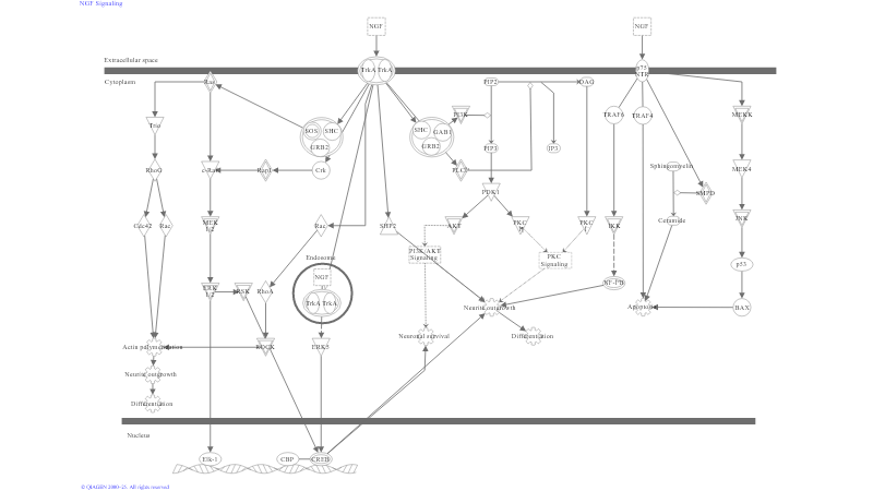A fundamental issue in current biology is the question of maintaining a critical balance between cell survival and cell death, both during development and in adulthood. In the nervous system, a family of neurotrophins which includes nerve growth factor (NGF), BDNF, and neurotrophins 3/4/5, maintains this critical balance. The best characterized of these is NGF, a neurotrophic protein which is important for the growth and survival of diverse peripheral and central neurons. It is expressed within discrete CNS areas and is secreted by tissues targeted by sympathetic and some sensory neurons. The effects of NGF on neuronal growth and survival are mediated by a high affinity cell surface receptor TrkA and a low affinity receptor p75(NTR)...