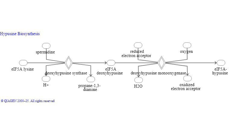 The eukaryotic translation initiation factor 5A (eIF-5A) must be activated by post translational modification before it can participate in the initiation of protein synthesis. The modification involves the addition of a butylamine residue (derived from spermidine) to a highly conserved lysine in the eIF-5A protein. This results in the formation of an unusual amino acid called hypusine. The biosynthesis of hypusine occurs exclusively within the eIF-5A precursor, and is catalyzed by two enzymatic steps, deoxyhypusine synthase (DHS) and Deoxyhypusine hydroxylase (DOHH). The strict substrate specificity for hypusine modification provides possible drug targeting of these enzymes, particularly in aberrant cell proliferation (