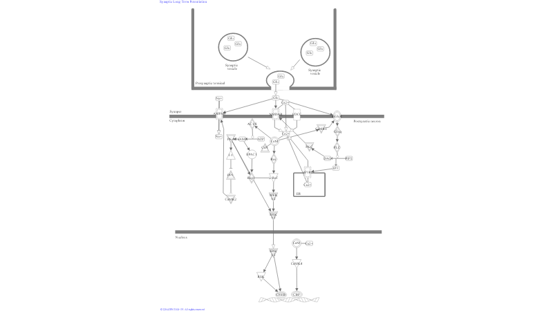 Long-term potentiation (LTP) is the increase of synaptic strength between two neurons following high frequency stimulation to the synapse. A majority of synapses that experience LTP (e.g. in the hippocampus) involve a postsynaptic increase in calcium which is mediated through activation of the ionotropic glutamate receptor N-methyl-D-aspartic acid (NMDA) receptor. Activation of NMDA receptors by glutamate released from the presynaptic neuron results in Ca2+ influx which coactivates the extracellular regulated signal kinase (ERK) and cyclic adenosine monophosphate (cAMP) signal transduction pathways...