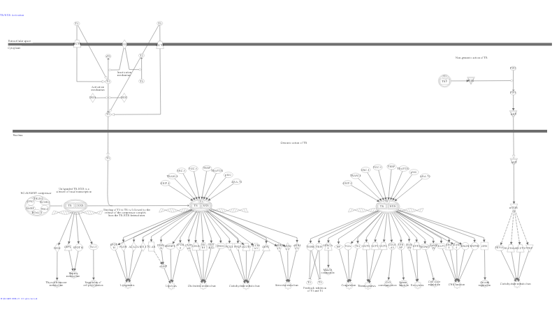 Thyroid hormone affects a range of biological processes such as growth, development and metabolism. The biologically active form of the hormone is triiodothyronine (T3); it acts through nuclear receptors TR (thyroid receptor) alpha and beta. TR is usually found as a heterodimer with RXR. Binding of T3 to TR releases the repressor complex from the TR-RXR heterodimer. T3 bound TR-RXR along with a number of co-activators can then regulate gene expression...