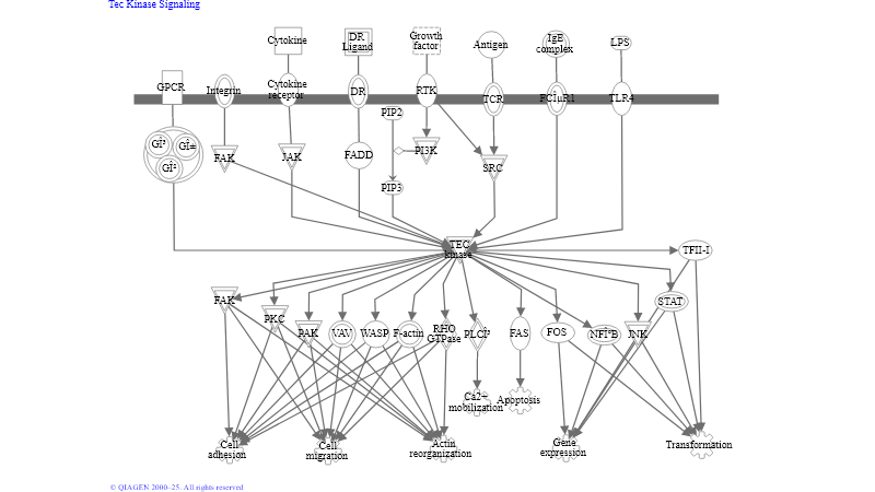 Non-receptor protein tyrosine kinases (PTKs) are essential for the development and activation of B-cells and T-cells. Tec kinases represent the second largest family of mammalian non-RTKs, which are activated in blood cells by stimulation of cytokine receptors, lymphocyte surface antigens, GPCRs and integrins. Tec family members include Tec, BTK, ITK/ EMT/TSK, BMX/ETK and RLK /TXK. Expression of most Tec kinases is restricted to hematopoietic cells and play an important role in the development or maintenance of the hematopoietic system. Tec, the founding member of the Tec kinase family is expressed in T-cells, B-cells and myeloid cells...