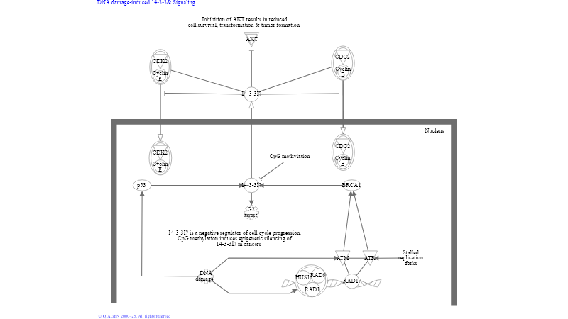 Loss of 14-3-3σ removes a key safeguard against propagation of DNA damage, allowing cells to bypass the G2/M checkpoint and divide with compromised genomes – an early step in carcinogenesis. Notably, 14-3-3σ is frequently silenced by promoter methylation in a range of epithelial-derived cancers, including breast, lung and colon tumors. This epigenetic inactivation prevents its transcriptional induction by p53 in response to DNA damage, effectively disabling this checkpoint arm and contributing to uncontrolled cell proliferation, genomic instability and resistance to DNA-damaging therapies.