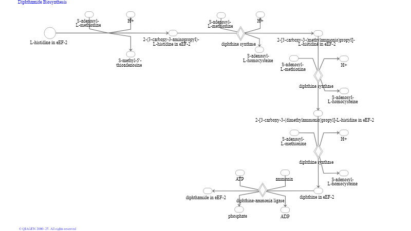 DIPHTHAMIDE is a unique posttranslationally modified histidine residue found only in translation elongation factor 2 (eEF-2). The role of diphthamide is still not understood. Mutant mice defective in its biosynthesis are retarded in growth and development, and almost always die before birth (