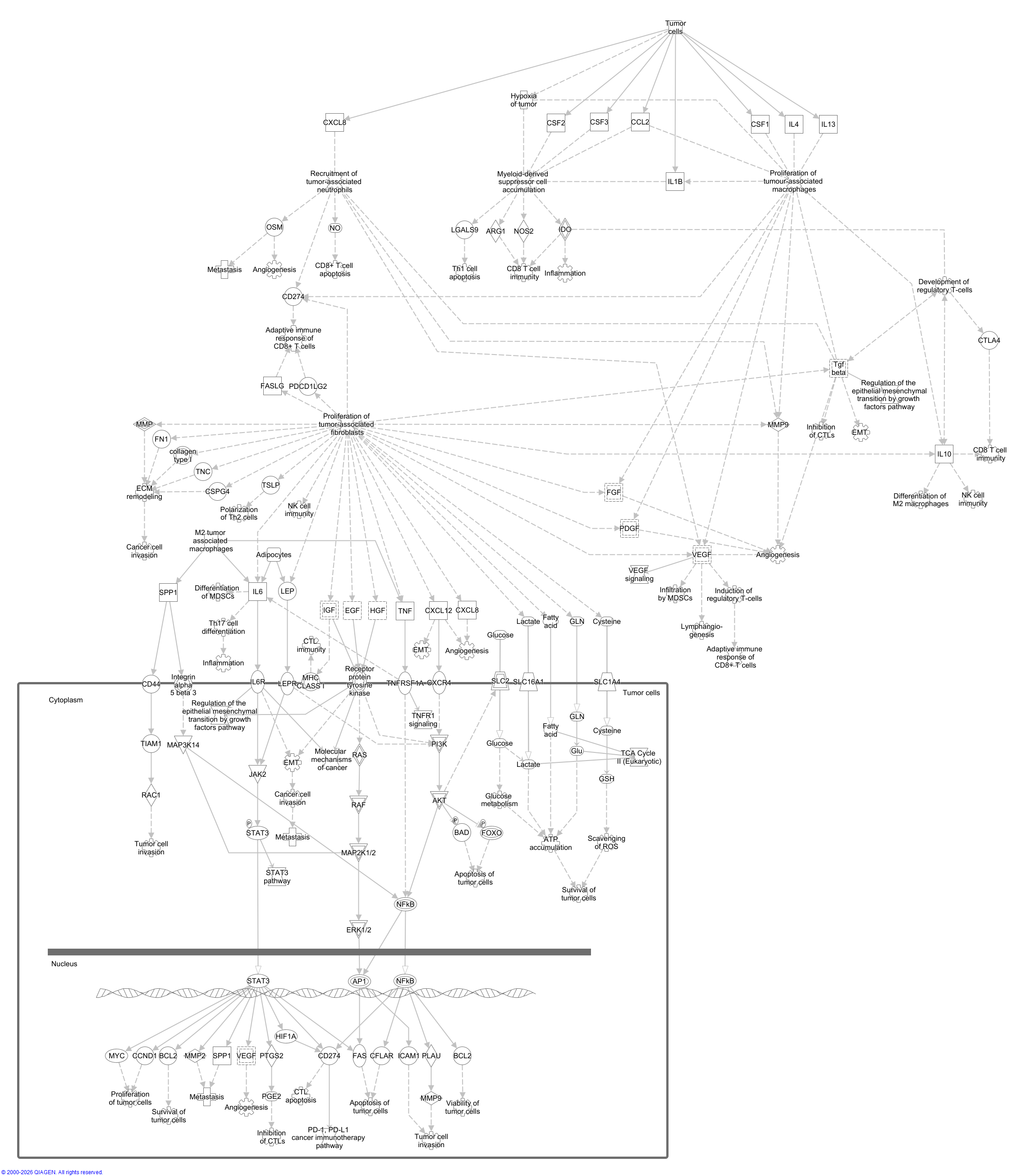 TME signaling is networked rather than linear. Hypoxia triggers VEGF (angiogenesis) and PD-L1 (immune checkpoints) simultaneously. Targeting a single pathway often fails, because the network adapts.