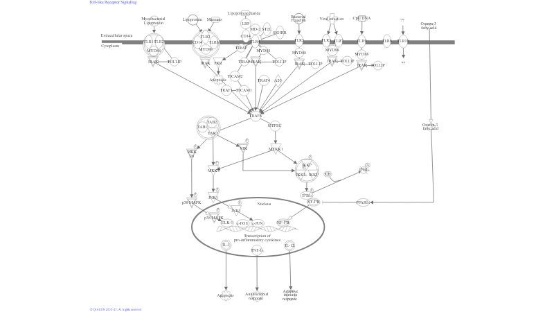 Toll-like receptors (TLRs) belong to the family of pathogen-associated pattern recognition receptors. TLRs are transmembrane receptors and that bind to specific molecular patterns in bacteria and viruses. To date 10 such receptors have been identified in humans and their pathogen-associated ligands include bacterial flagellin, viral DNA, lipopolysaccharides and CpG DNA motifs. TLRs either singly or as heterodimers form a complex with different combinations of adapter molecules like MyD88, TRAF6 and TIRAP to initiate signal transduction upon ligand binding.Binding of ligand to TLR triggers a cascade of signaling events via the TLR-adapter complex...
